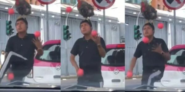 Malabarista sorprenden con un gallo en la cabeza y se hace viral